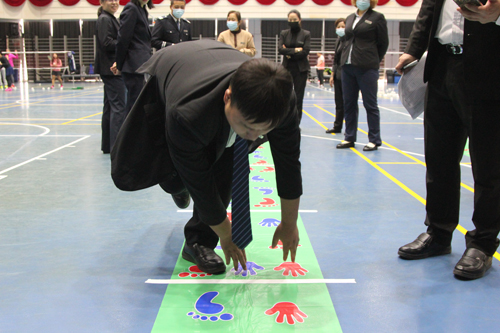 首先開始的項目是“手腳并用”。要求參賽隊員手腳配合快速通過地面噴繪圖上的難關(guān)。在噴繪圖上交錯標(biāo)著手腳部位,參賽隊員只能用對應(yīng)的手腳去接觸,按指定線路前進(jìn),不能跳格,看誰最短時間到達(dá)終點。比賽過程中,一些隊員手足亂放的尷尬狀態(tài),令周圍觀眾捧腹大笑。餐廳主管徐詠梅手腳靈敏,身體輕盈,僅用11秒就順利通關(guān)。
