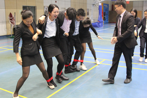 “齊心協(xié)力”尤為精彩。要求參賽隊員每6人為一組,將相鄰兩人的兩只腳捆縛一起,哨聲響起后,在一名隊員的指揮下,大家同時向側(cè)面行走,最快走到終點的獲勝。行走過程,有的步履艱難,有的不慎摔倒,但是最終依靠團(tuán)隊的力量走到終點,在激烈競爭的氣氛中,真切體會到什么是步履艱難,什么是團(tuán)結(jié)的力量。最后,財務(wù)部陳鍵鋒領(lǐng)銜的團(tuán)隊摘取桂冠。