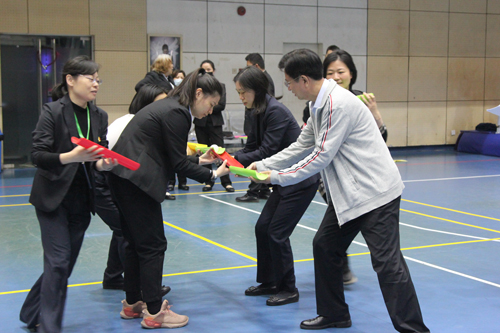 接下來是“珠行萬里”。要求參賽隊員通過共同傳遞一個圓球,感受團(tuán)隊間有效的配合、銜接以及自我控制能力,培養(yǎng)團(tuán)隊的責(zé)任感。比賽時,隊員們一字排開,手持接力棒,保證圓球不掉落,快速到達(dá)終點。餐廳經(jīng)理陶應(yīng)義帶領(lǐng)一群生龍活虎的服務(wù)員,毫無懸念獲得了第一名。
